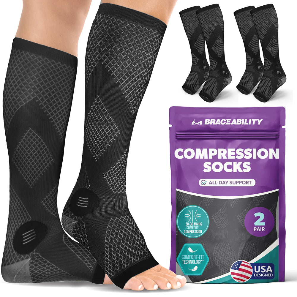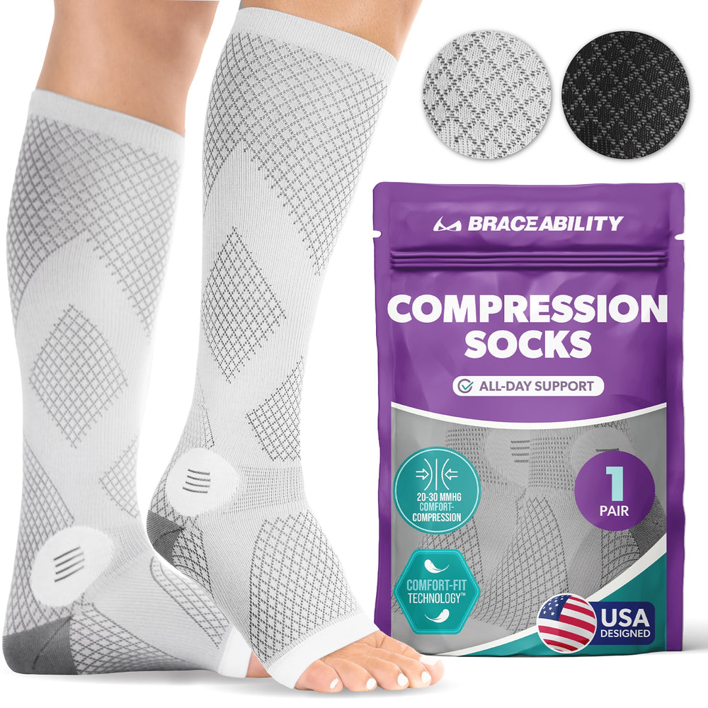Our Knee High Open Toe Compression Socks blend medical efficacy with everyday comfort, making them an essential part of your health routine and daily life. Perfect for both daily wear and specific medical needs, these socks provide support tailored to your lifestyle, allowing comfort and mobility to coexist seamlessly. For those preferring less coverage while still enjoying the benefits of compression, our Ankle Compression Sleeve Socks offers targeted support specifically for the ankle area. Experience the comfort and change with BraceAbility’s range of compression products. Embrace a life where comfort meets functionality.