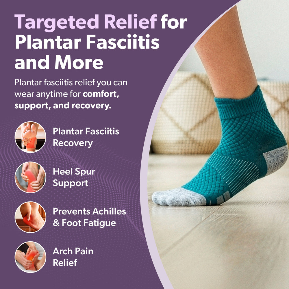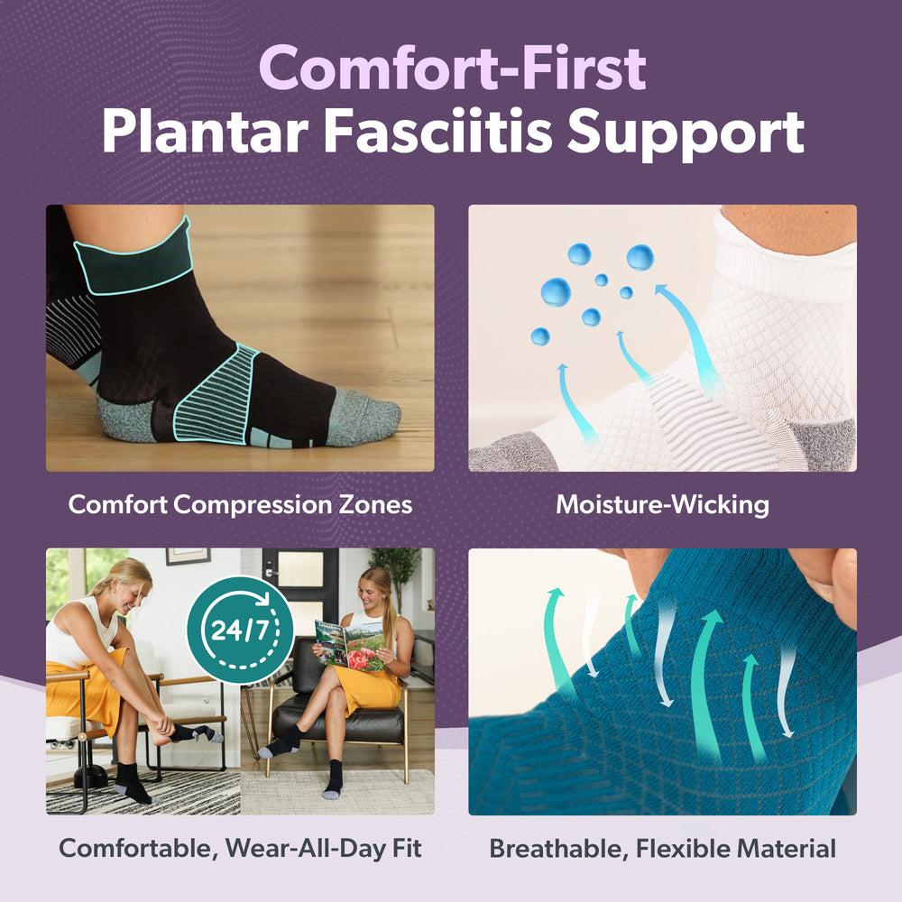 - How do these socks help with plantar fasciitis? These socks provide targeted compression at the arch, heel, and Achilles tendon to reduce strain on the plantar fascia. This helps relieve pain, improve circulation, and support healing.
