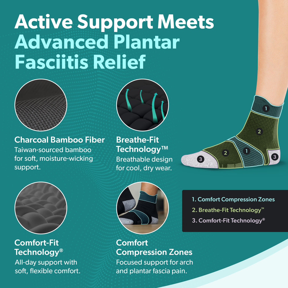 Crafted with a blend of innovative materials, these socks are made with soft bamboo fibers that naturally help absorb moisture, reduce odor, and promote a dry, comfortable feel. Combined with Breathe-Fit™ Technology, a breathable, quick-drying fabric that actively wicks away sweat, this advanced design helps keep your feet cool, dry, and fresh throughout the day. Whether you're recovering from plantar fasciitis or staying active on your feet, this dual-fabric system delivers lasting comfort and reliable support when you need it most.
